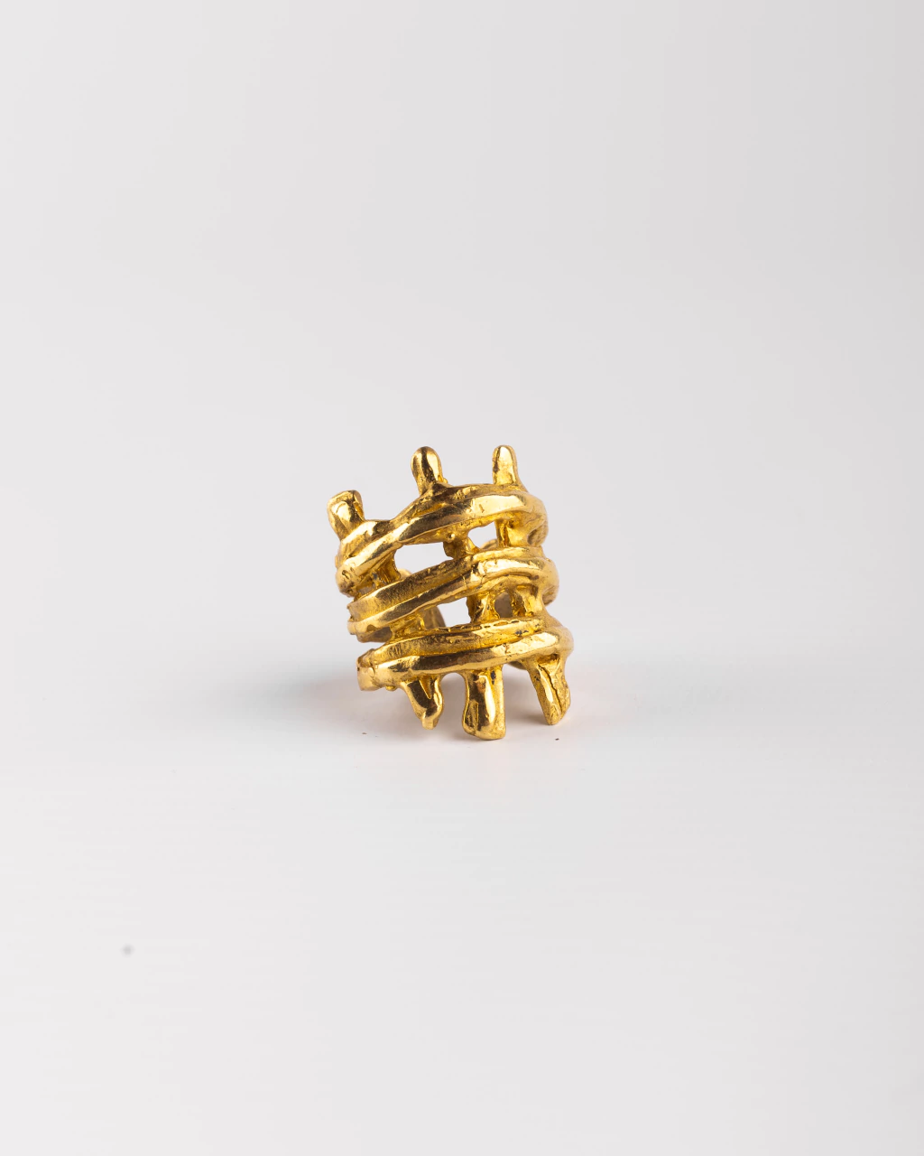 El Anillo Reja es una joya artesanal moldeada en cera, lo que le otorga una forma orgánica, firme y detallada.